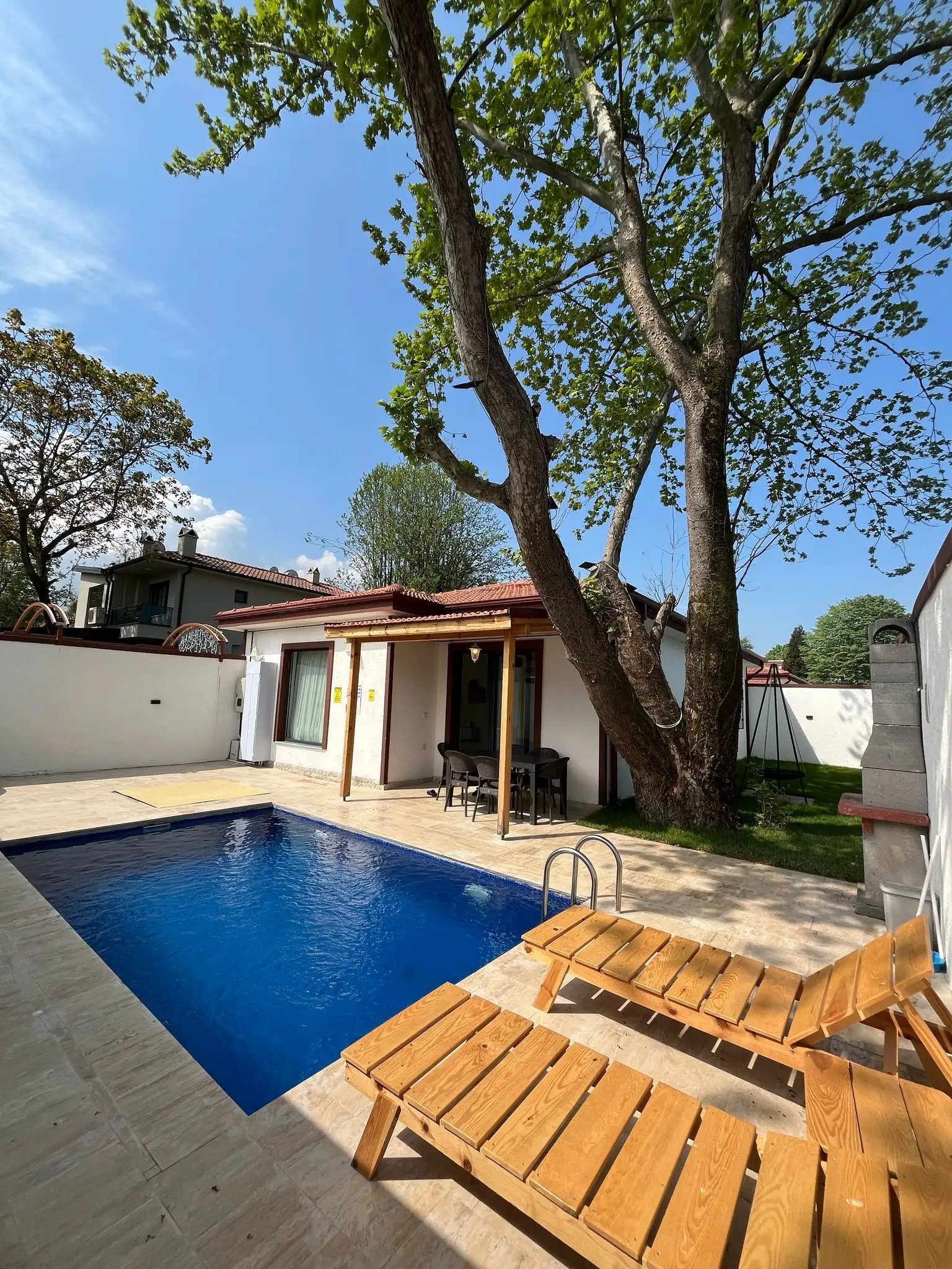 Bahçe: Özel ısıtmalı havuz( 3x6 1.50 m derinlik), jakuzi, barbekü, salıncak, ateş kazanı, şezlong, şemsiye, bahçe mobilyaları bulunmaktadır.