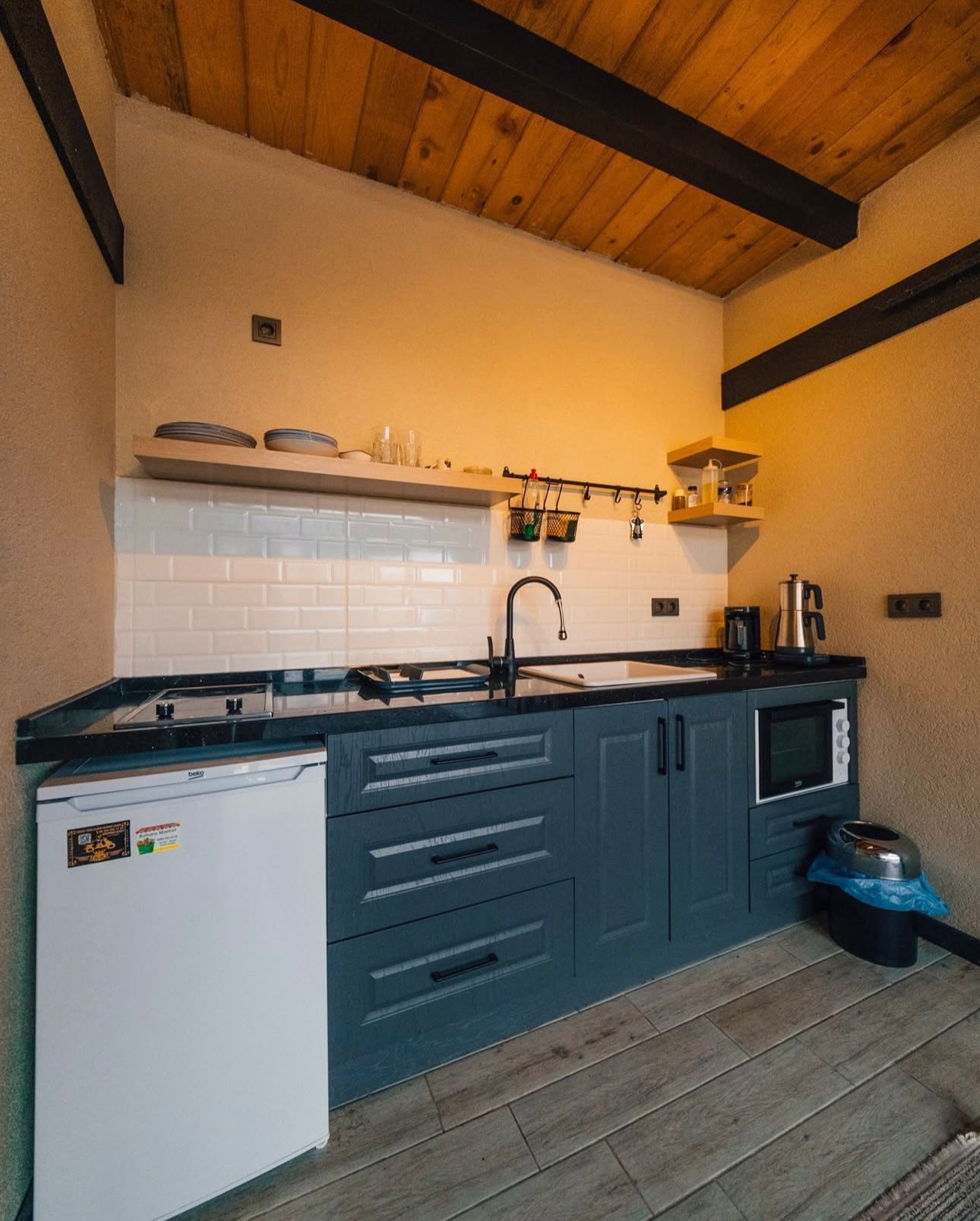Mutfak: Ocak, mini buzdolabı, kettle, çaycı, kahve makinası, mutfak araç ve gereçleri