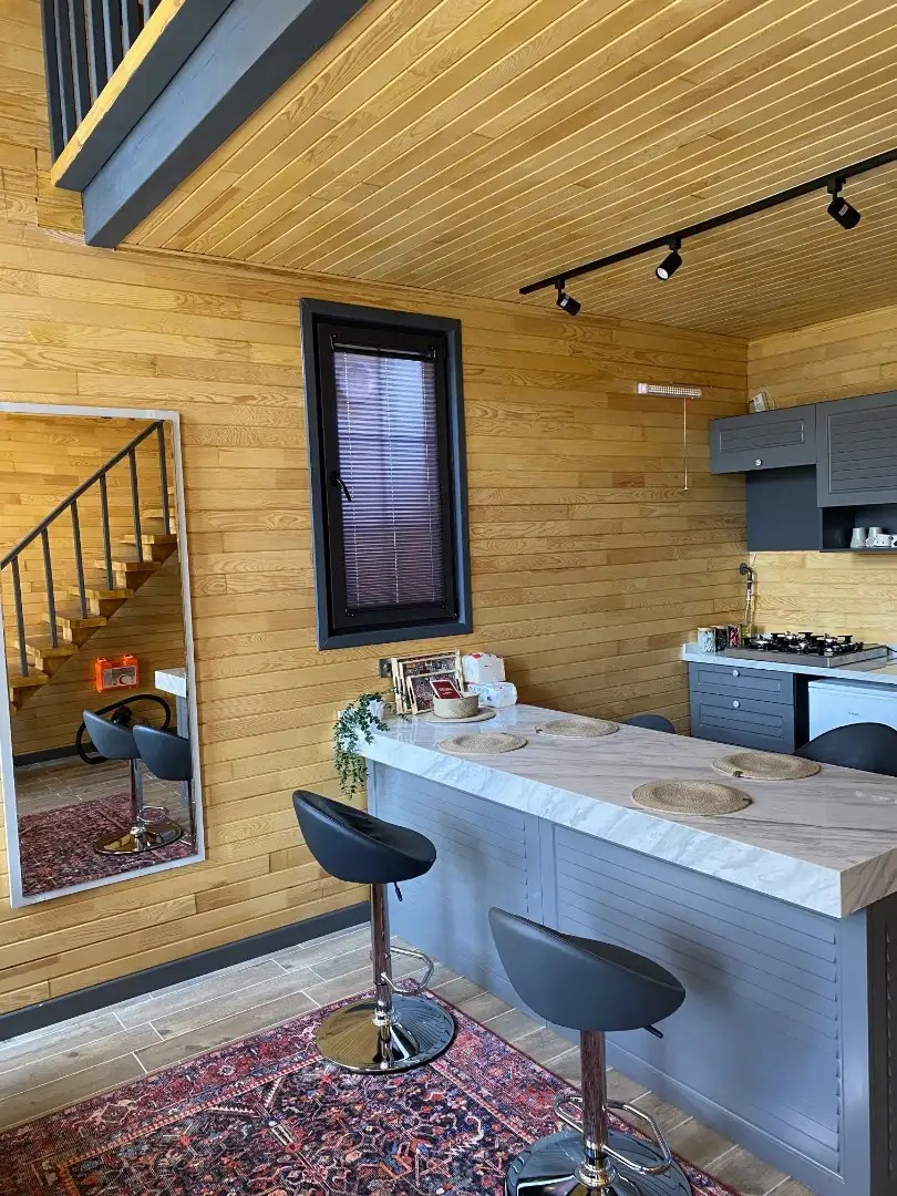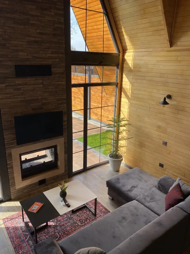 Salon: Açılabilir L koltuk, şömine, televizyon, Wifi ve wc & banyo bulunmaktadır.