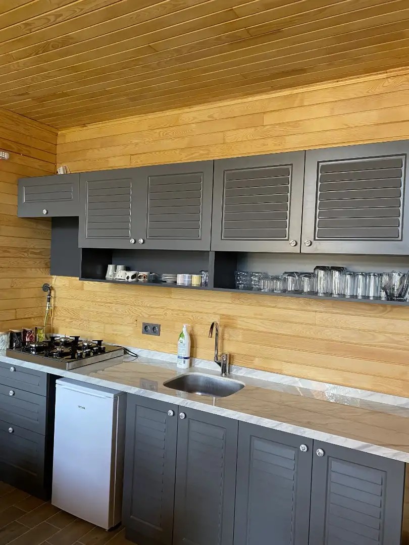 Mutfak: Set üstü ocak, çay makinesi, kahve makinesi, çay kahve seti, tabak, bardak, çatal, kaşık, bıçak ve mini buzdolabı bulunmaktadır.